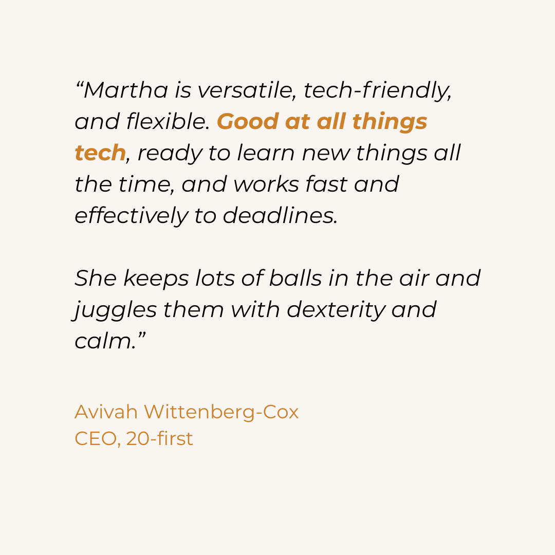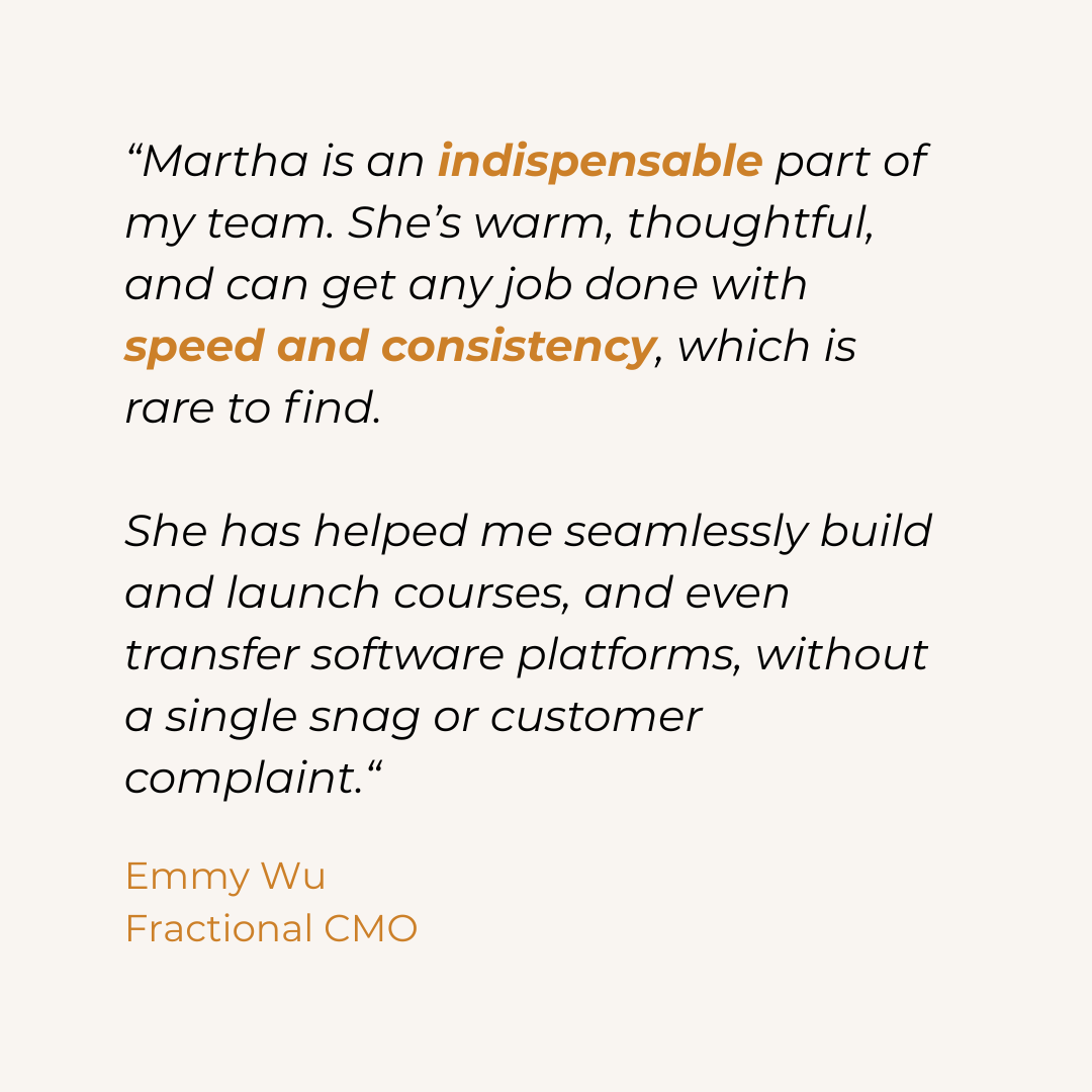 Martha turns chaos into clarity. When things catch fire, she runs toward it, organizes the moving parts, and gets the work done so you can focus on what matters.